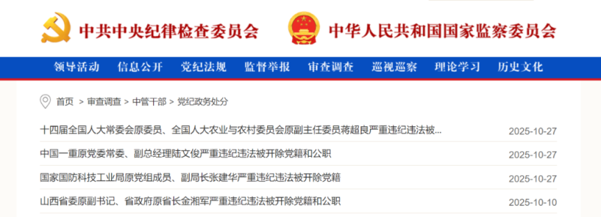 此外还有:广西壮族自治区玉林市中级人民法院原党组书记、院长胡海兰被开除党籍和公职,湖南省农村信用社联合社原党委委员、副主任舒立凡被开除党籍,重庆两江投资集团原党委书记、董事长李谨被开除党籍,大连海关原党委书记、关长刘大立被开除党籍和公职,中国中纺集团有限公司原党委书记、董事长刘云被开除党籍和公职,等等。