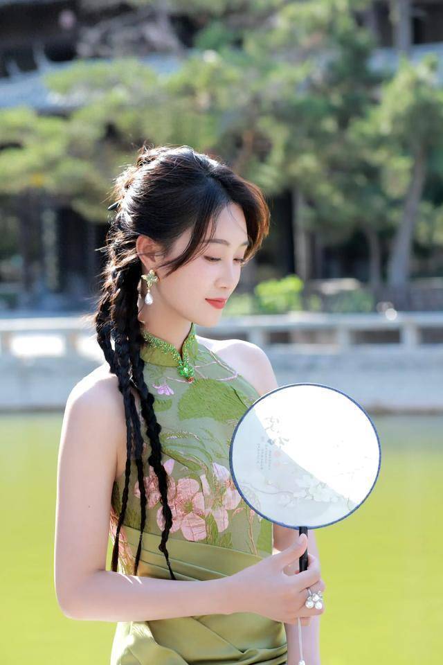 她手中那把圆形扇子,更添几分大家闺秀的温婉气质,仿佛瞬间将人带入悠远的情境之中。一头乌黑长发,胸前编织的黑色辫子,将女性的羞涩与温柔展现得恰到好处,尽显温婉大方之态。