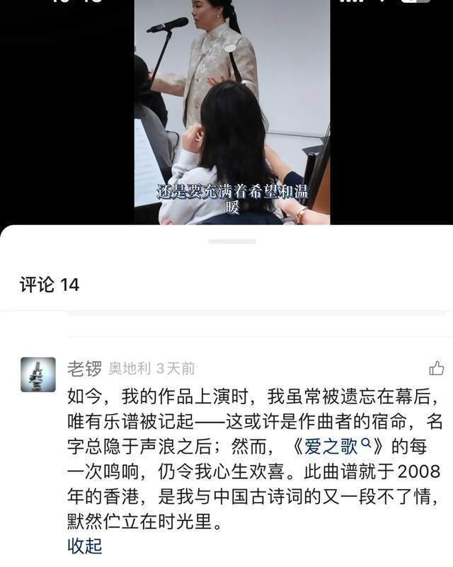 他说自己作为作曲者总是被遗忘在幕后,只有乐谱被记起,认为这是作曲者的宿命,名字总是隐藏在声浪之后。又好笑又尴尬,这番话看似清高,实则充满了想要被关注、被记住的渴望。面对这番突如其来的“酸言酸语”,龚琳娜的处理方式非常体面,她没有在评论区与之纠缠,也没有视而不见,而是转头单独发了一条正式的帖子,专门介绍:“前夫哥创作的《爱之歌》”。她在帖中详细说明了这首作品,通篇语气平和,只谈艺术,图片c位给了老锣大大的署名。这种大方得体的回应,与老锣在小角落里散发怨气的行为形成了极其鲜明的对比。
